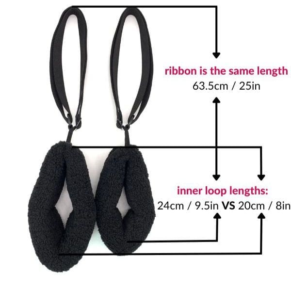 Made differently from any other fuzzies out there: the ribbon is on the outside and you benefit from the full thickness of the lining. This gives you great support for hanging upside down or when doing weight-bearing exercises. No more chafing!